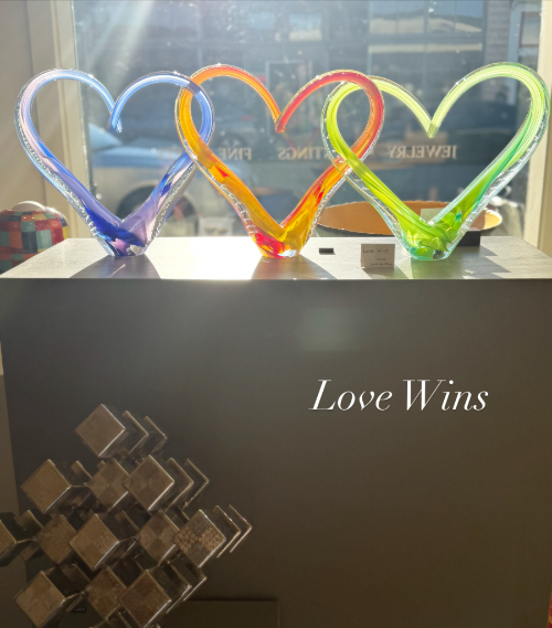 MaJe Gallery invites you to choose artisan jewelry from one of the shop’s 40 designers for a unique and meaningful gift. At Hoadley Gallery West, the colorful “Love Wins” glass sculpture by Scott Hartley features three intertwined hearts—just the message the whole world needs now.